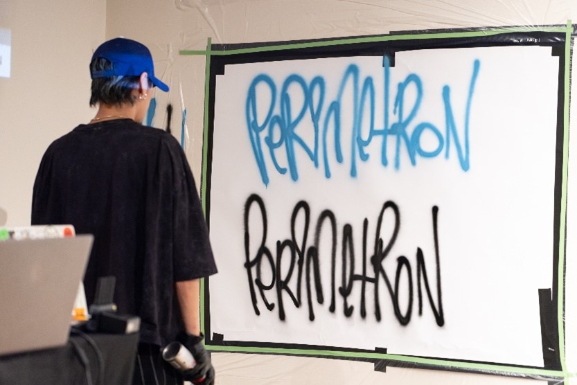 森さん「モットーとして、パソコンから出して自分を通したものを何かしら入れたいと思っています。手書きで描くのが好きで、スプレーの質感とか見栄えが派手でいいかなと思います」