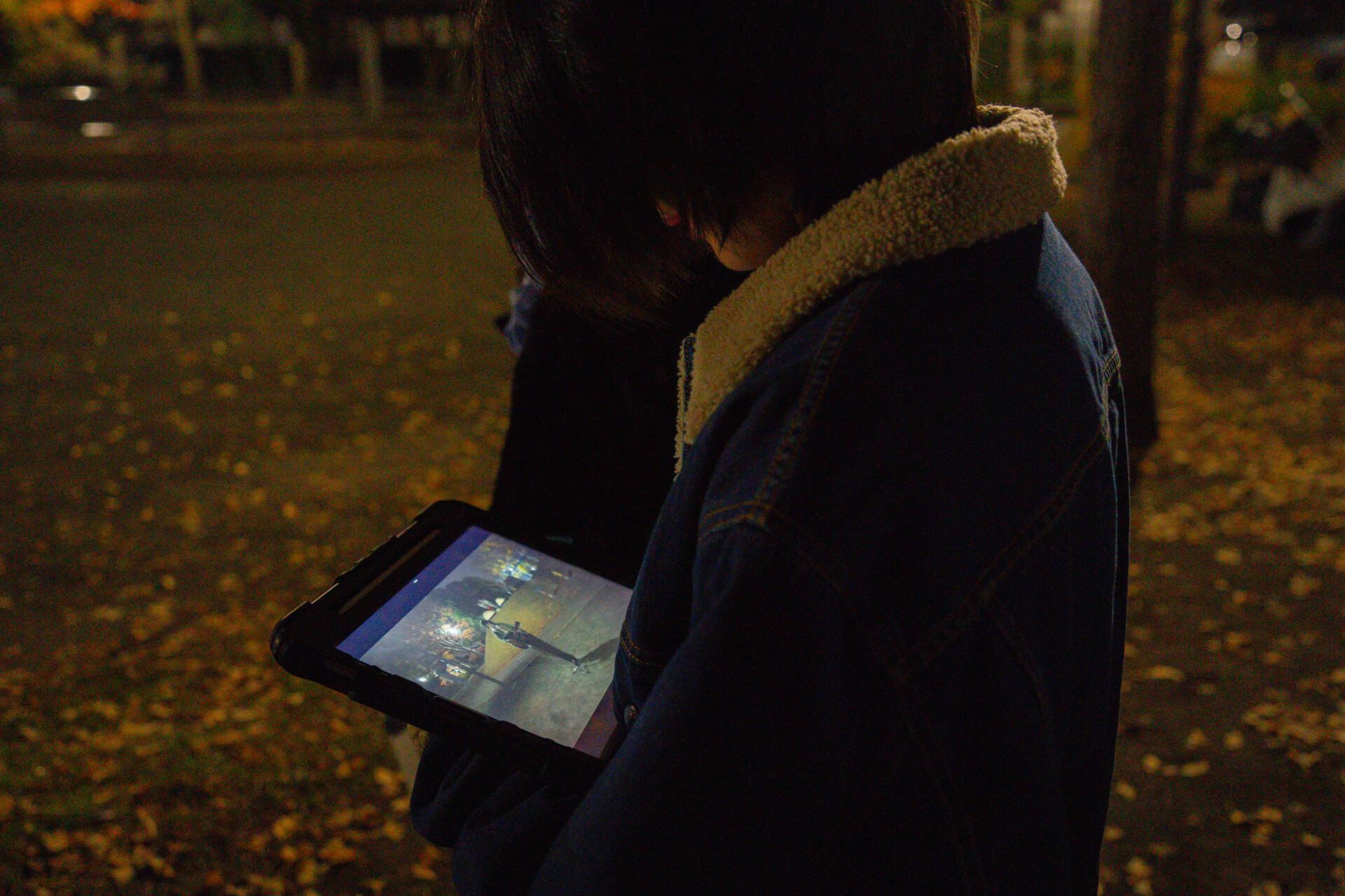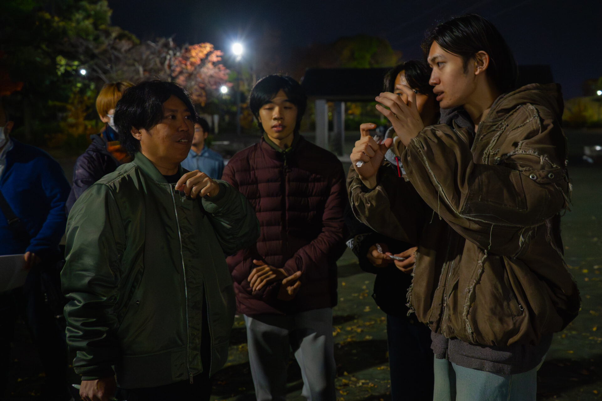 現場では照明担当も活躍。中野森講師と話していたのは、照明担当の3人のメンバー。公園の丘の上にある遊具を照らす役割です。