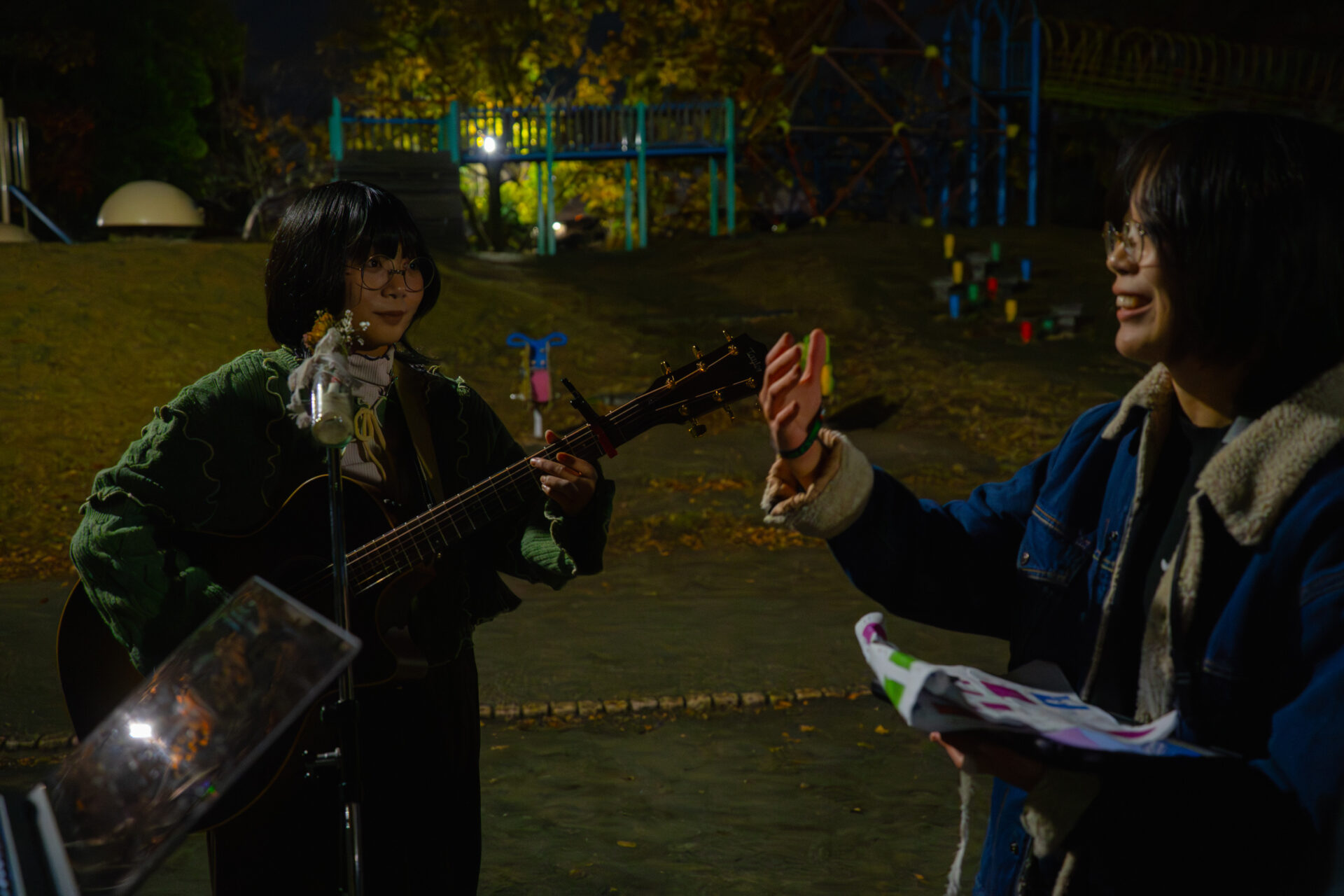 公園の明かりの下で、ギターを弾きながら歌うさとう。さん。その周りを、前後左右へと動き回りながら、撮影を行っていたのは、イマガワハルネさん。今回はメインカメラの担当で、講師が横についてアドバイスをしながら撮っていきます。