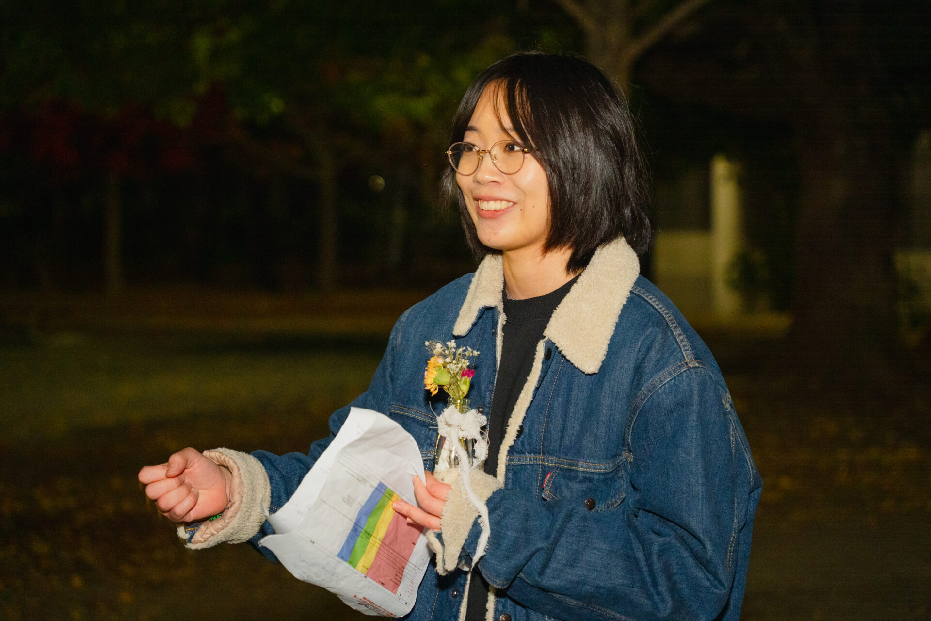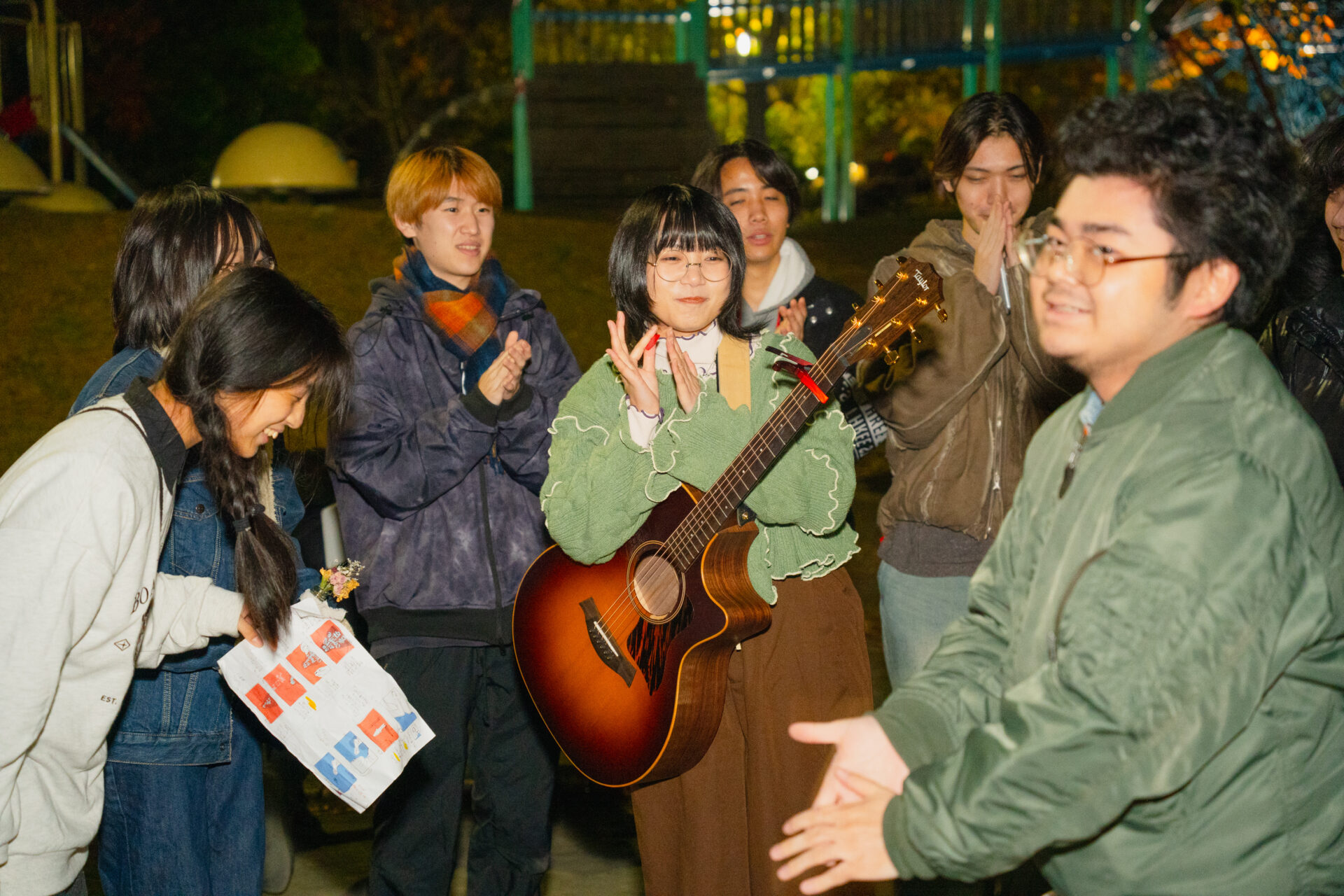 夜9時を過ぎたところで、「オールアップです!」と声がかかり、すべての撮影が完了。メンバーたちがアーティストの周りに集まってきました。そこで、みんなの拍手が夜の公園に響き渡ります。