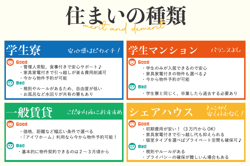 学生寮、学生マンション、一般賃貸、シェアハウス…結局どれが一番いいの?