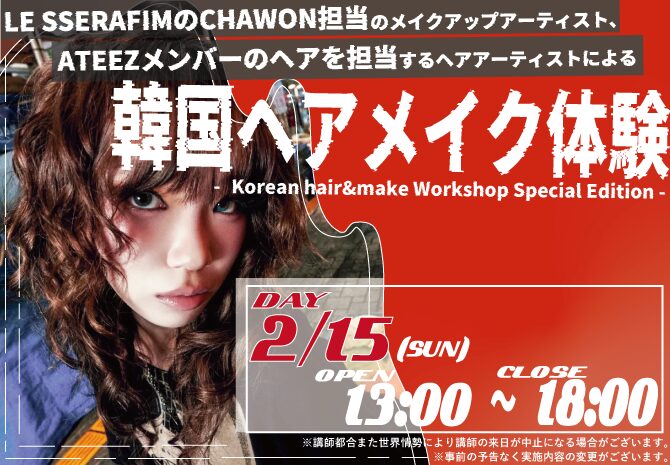 ■ヘアメイク【ヘアメイク体験】 ■ファッション【ファッションスタイリング体験】 ■韓国ヘアメイク【韓国ヘアメイク体験】 2026年2月15日(日)13:00~18:00 ※講師都合で日程・時間が変更になる可能性がございます。 |