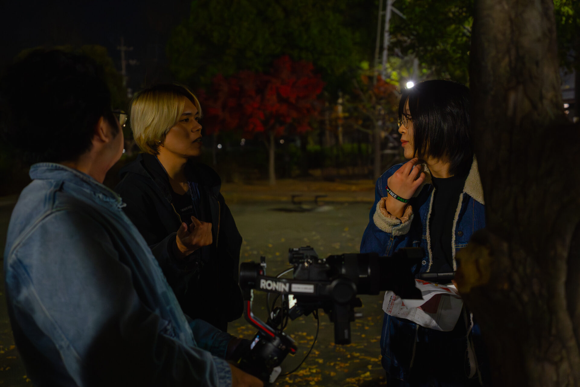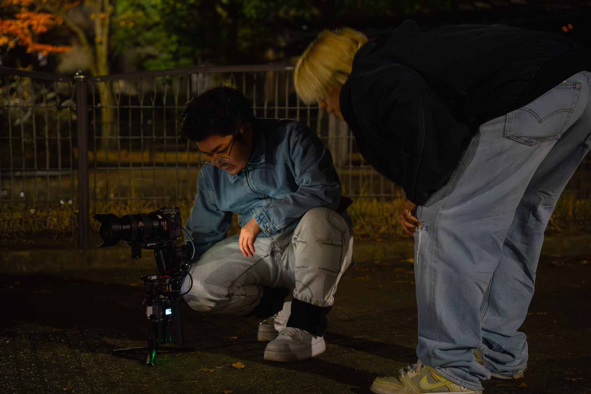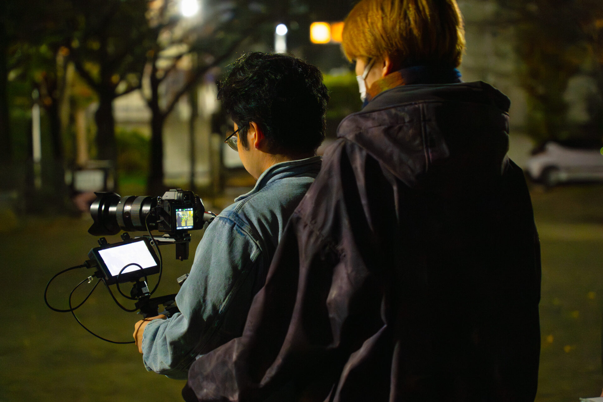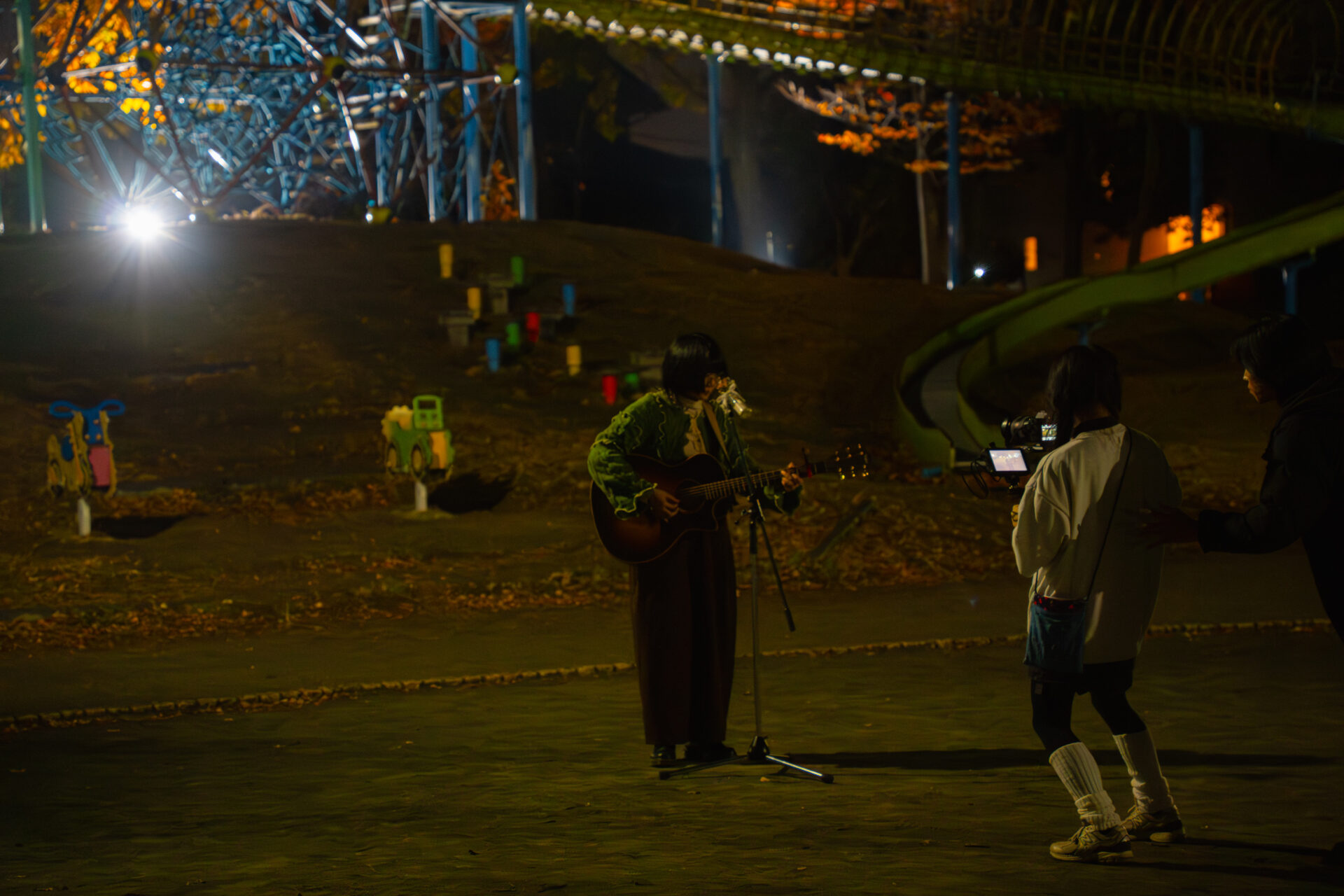 公園の明かりの下で、ギターを弾きながら歌うさとう。さん。その周りを、前後左右へと動き回りながら、撮影を行っていたのは、イマガワハルネさん。今回はメインカメラの担当で、講師が横についてアドバイスをしながら撮っていきます。