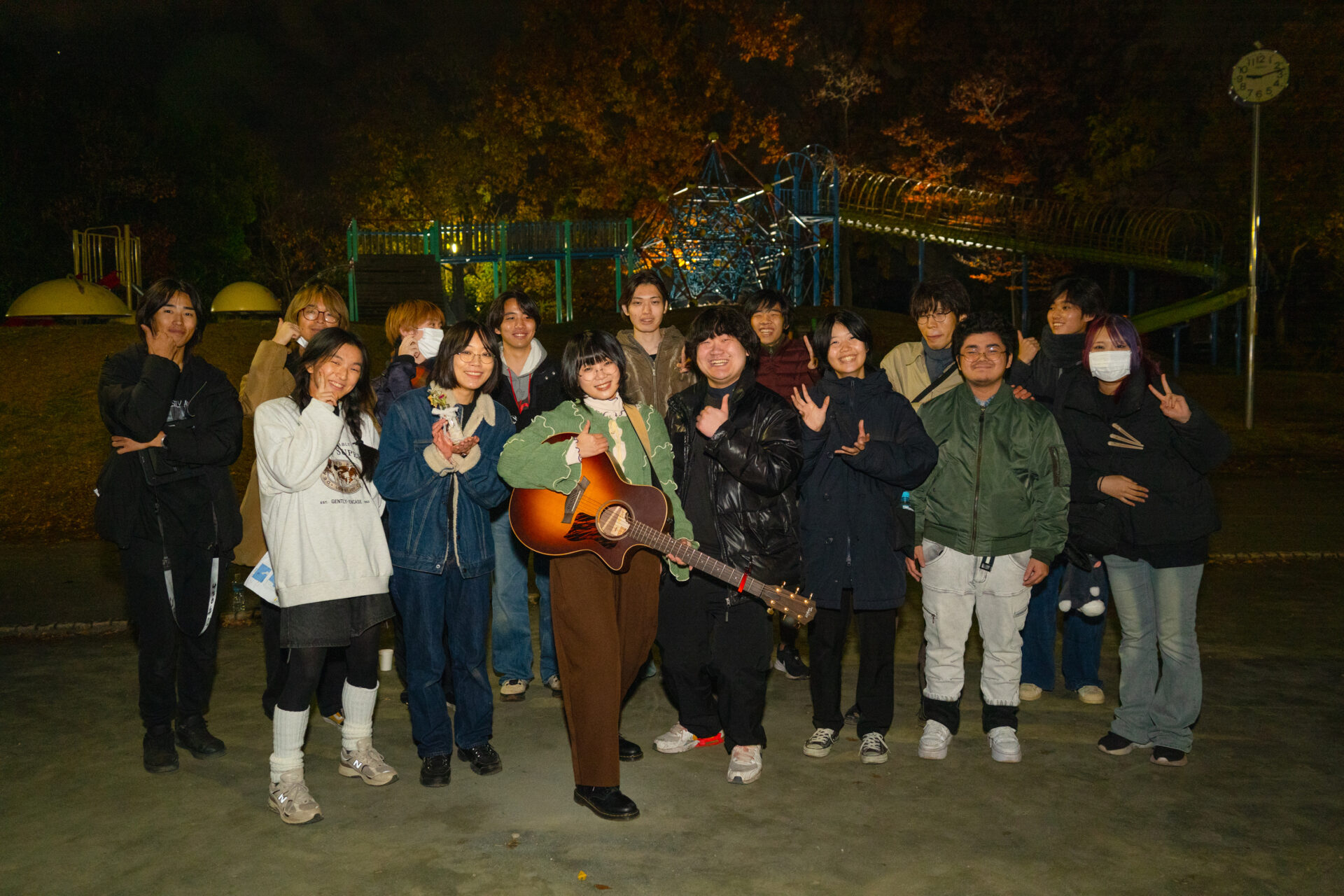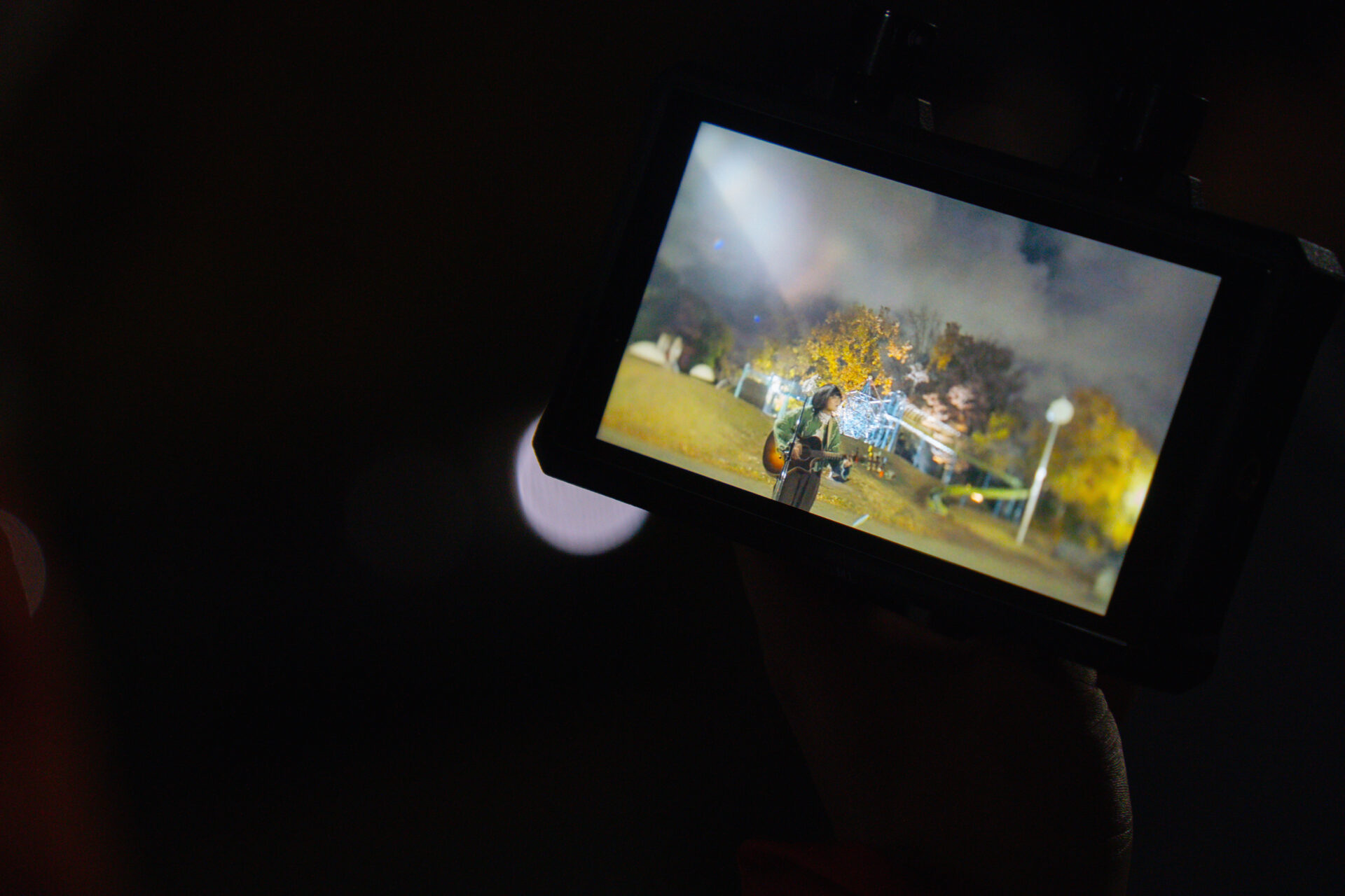 夜9時を過ぎたところで、「オールアップです!」と声がかかり、すべての撮影が完了。メンバーたちがアーティストの周りに集まってきました。そこで、みんなの拍手が夜の公園に響き渡ります。