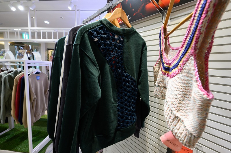 今回はそれとともに新たなブランド「Curtain Call」をお披露目。「SEi」ではハンドメイドの1点ものでしたが、既成のアイテムにニットを編み込むといった新たな商品も。プリントされた絵柄はかつて友人に依頼されて描いたものだそうです。
